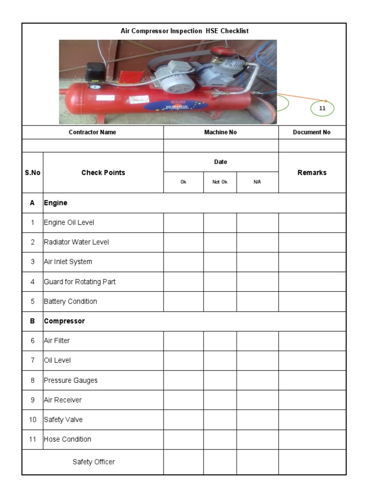 Air Compressor Inspection HSE Checklist (1) PDF - Use this preventive maintenance checklist for an air compressor in operation. This document is an inspection checklist for an air compressor. The templates are intended to be used. Take photos and add notes for each equipment. Check, clean and change components. You should also read this: Time And Effort Reporting Federal Grants Template