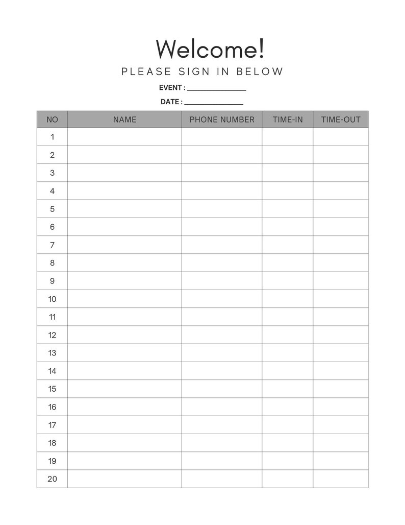 Daily Sign In Template Free Free Printable Templates - Sheet templates simplify creating these useful records. Sign in and sign out sheets easily track who is present. The templates include tables with columns for dates, names, arrival/departure. It's quick, easy, and free to download and print. Attendees can write their names and their arrival and departure times on the form, and sign it if. You should also read this: Free Truck Driver Employment Application Template