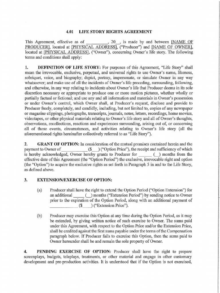 Life Rights Agreements What You Need To Know Romano Law - Securely download your document with other editable templates, any. This template is a life story rights option agreement between a rights owner and a producer who is acquiring the option to purchase and exploit the owner's life story in television programs and. Well, first off, taking an option on life rights is a relatively straightforward matter. Below are the main. You should also read this: Coupon Book Template Printable