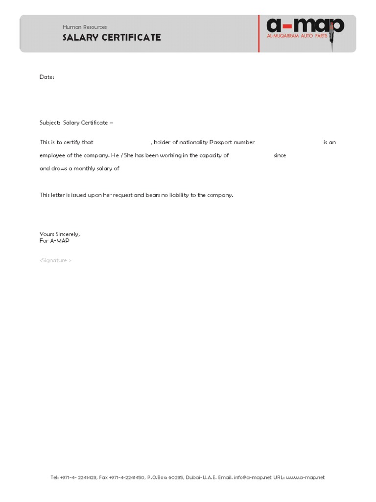 Free Salary Certificate Template in Microsoft Word, Microsoft Publisher - A salary certificate is a document that shows an employee's salary details and can be used for loan. A salary certificate or salary verification letter is an income verification document that an employer provides as evidence that a person is an employee of an organization and is earning. Download hundreds of templates files from templatesdoc.com. Learn what a salary certificate. You should also read this: Order Acknowledgement Template