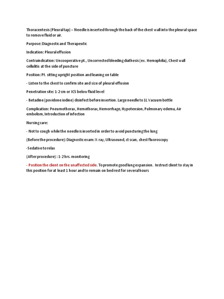Thoracentesis and Thoracostomy Procedures Indications, Positions - Study with quizlet and memorize flashcards containing terms like what is thoracentesis?, how should a nurse position a client for a thoracentesis?, what are nursing actions to prepare for. Thoracentesis is performed under local anesthesia by a provider at the clients's bedside, in a procedure room, or in a provider's office. Your documentation in the medical. Diagnostic procedure morgan trial. You should also read this: Capcut Templatescom